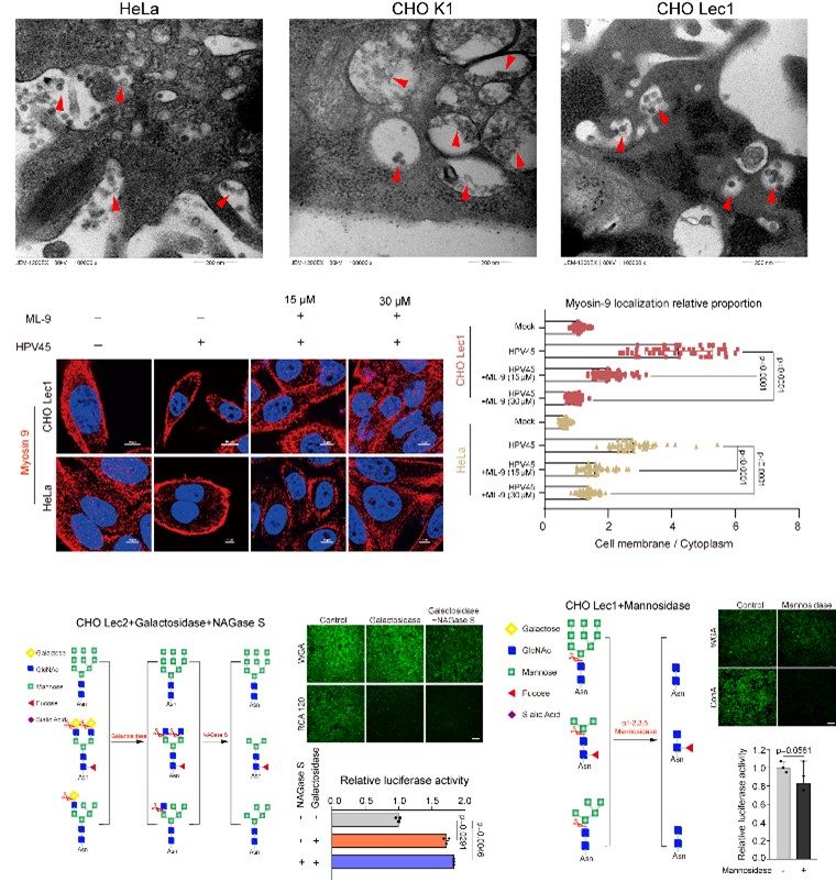 近日,王伟教授课题组在HPV进入受体和内吞机制研究方面取得最新进展。研究团队利用HPV假病毒感染体系结合糖链缺失细胞系研究糖链对HPV侵染的影响,发现HPV45感染N-糖链缺失的CHOLec1细胞水平显著高于CHOK1细胞,且其主要通过动力蛋白依赖但肌动蛋白非依赖性感染途径,这与 HeLa 和 CHOK1 细胞中感染途径不同。进一步利用免疫垂钓结合质谱方法鉴定出HPV潜在感染受体肌球蛋白-9(myosin-9),并利用细胞功能抑制和小鼠生殖道模型验证了myosin-9确实是HPV感染的功能性进入受体。这表明myosin-9有潜力成为抗HPV药物的新靶标。